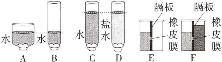 (4)如图F所示,水对橡皮膜有向右的压力,另一种液体对橡皮膜有向左的压力,橡皮膜恢复原状时,橡皮膜两侧受到的压力相等,则橡皮膜左右两侧受到的压强相等,即$\rho_{水}gh_{水}=\rho_{液}gh_{液}$,因$h_{液}>h_{水}$,所以$\rho_{液}<\rho_{水}$;将图E装置的隔板与橡皮膜同时向左移动一些,向隔板左右两侧注入深度相同的水时,隔板两侧的水的质量不同,由$p = \rho gh$可知橡皮膜两侧受到的压强相同,即橡皮膜将不发生形变,进一步证实了液体压强与液体的质量无关。