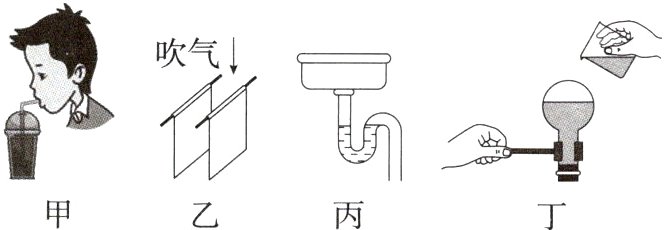 A:用吸管喝饮料时,是先把吸管内的空气吸走,在外界大气压的作用下,饮料被压进吸管里,故A错误,符合题意;吹气时两纸间的空气流速较大,纸向中间靠拢,说明在空气中,流速大的位置压强小,故B正确,不符合题意;洗手槽排水管下方设计成U形“反水弯”,利用了连通器原理,故C正确,不符合题意;停止沸腾的水,浇上冷水后容器内的部分水蒸气发生液化,使得液面上方的气压减小,水的沸点降低,水再次沸腾,故D正确,不符合题意。