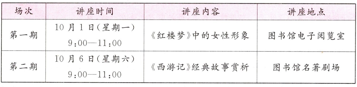 为了进一步提高人们阅读古典名著的兴趣,推动全民阅读,我市图书馆将在国庆假期期间开设“中国古典四大名著赏读”宣讲活动。活动期间邀请“古典名著”讲师团成员进行两期讲座,具体安排如下:
