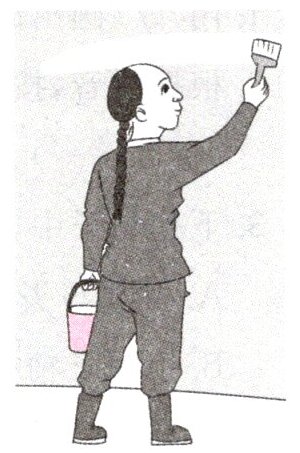 一间屋子,一个屋顶四面墙,先刷屋顶后刷墙。屋顶尤其难刷,蘸了稀溜溜粉浆的板刷往上一举,谁能一滴不掉?一掉准掉在身上。可刷子李一举刷子,就像没有蘸浆。但刷子划过屋顶,立时匀匀实实一道白,白得透亮,白得清爽。有人说这蘸浆的手法有高招,有人说这调浆的配料有秘方。曹小三哪里看得出来?只见师傅的手臂悠然摆来,悠然摆去,如同伴着鼓点,和着琴音,每一摆刷,那长长的带浆的毛刷便在墙面啪地清脆一响,极是好听。啪啪声里,一道道浆,衔接得天衣无缝,刷过去的墙面,真好比平平整整打开一面雪白的屏障。可是曹小三最关心的还是刷子李身上到底有没有白点。