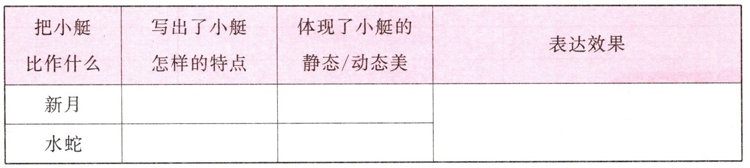 1. 船头和船艄向上翘起,像挂在天边的新月;行动轻快灵活,仿佛田沟里的水蛇。