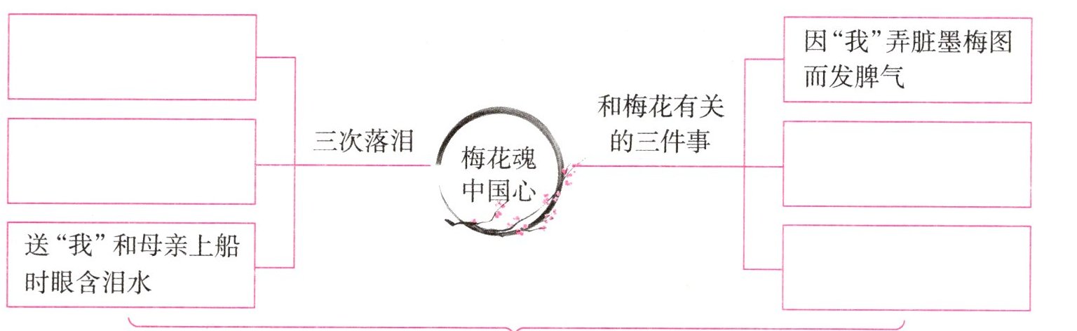 教“我”读唐诗宋词时落泪@@临别前送“我”墨梅图@@因不能回国而难过得哭起来@@船快开时送“我”绣着梅花的手绢@@对祖国和故土的思念和热爱