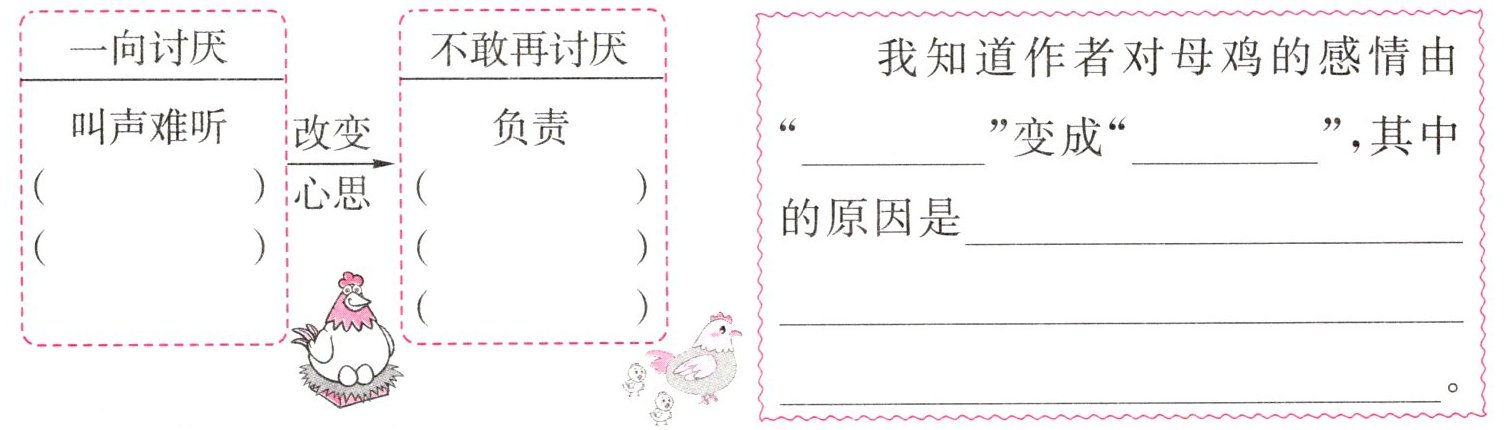 (从左至右)欺软怕硬 爱炫耀 慈爱 勇敢 辛苦 讨厌 不敢再讨厌@@母鸡负责、慈爱、勇敢、辛苦,作者为母鸡身上表现出来的母爱所震撼。