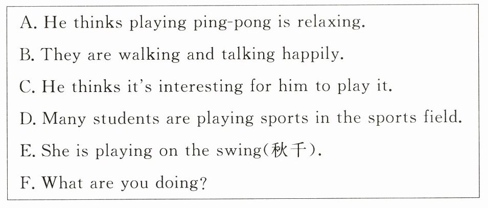 Today is Wednesday. It's four in the afternoon. 1. ________ Look! Liu Wei is playing volleyball with his classmates. Some girls are watching them playing volleyball. They look very happy. Liu Wei likes playing volleyball. 2. ________ And he is good at it. He is in the school volleyball club. And he often teaches his classmates to play volleyball. Zhang Hua likes ping - pong. 3. ________ Now he is practising playing ping - pong with his friends. Next week, they will have a ping - pong game, so they practise hard these days. Some students are taking a walk in the playground. 4. ________ Some students are in the classroom. They are talking about their studies. The girl in a pair of glasses looks very happy. 5. ________