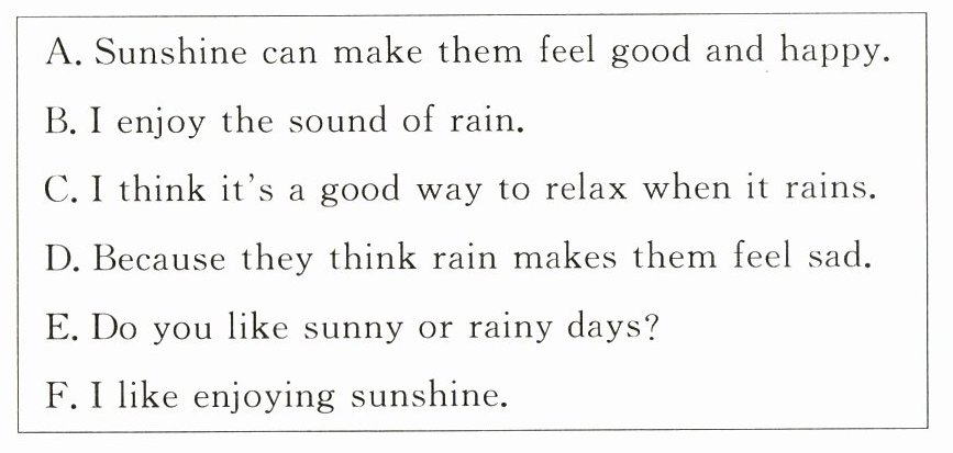 I like sunshine very much, but I also enjoy rain. 4. ________ It can make me feel quiet. On rainy days, I like listening to music and doing some reading, or just looking at the rain and daydreaming(做白日梦). When you daydream, you don't have to think about other things. 5. ________