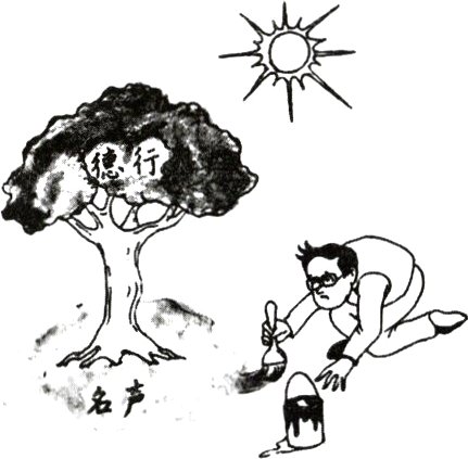 (1)内容:画面中太阳下有一棵树,树冠上写着“德行”,树影上写着“名声”,树下一个人拿着刷子刷地,想努力扩大树影面积。寓意:德行如树,名声如影。德行高尚,名声才能响亮,做人若只想扩大名声,不重视德行,就是在舍本逐末。(意思对即可)