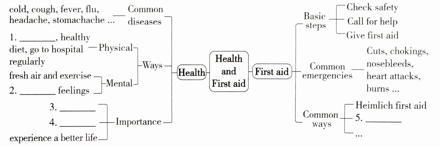 Ⅳ. 讲座结语 讲座已经接近尾声,老师给我们总结了一些关于疾病救护的内容,鼓励同学们积极参与安全健康教育,让我们根据讲座内容和自己的经历,完善一下这份思维导图吧!