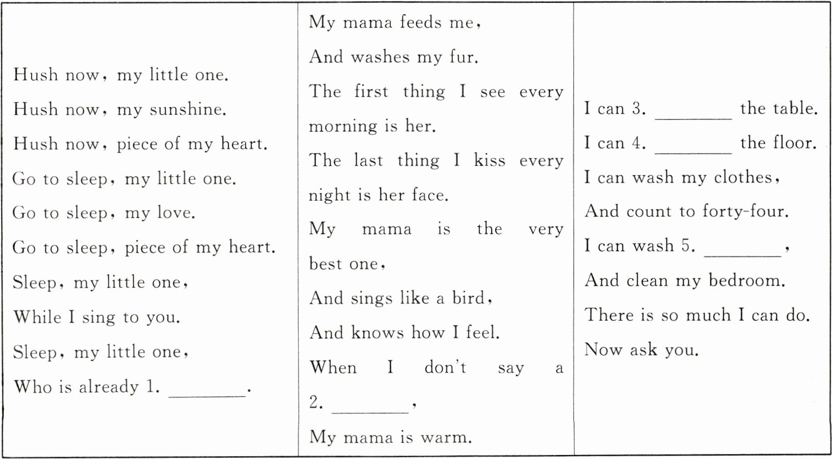 Chores help improve life skills.They’re young now, 4._ when they grow up, they need to do some chores, such as washing, cooking, making the bed and 5._(sweep)the floor.They can’t learn them at school.
