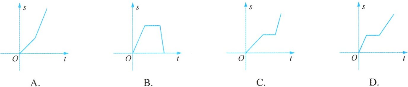 9. 李老师骑自行车上班.最初以某一速度匀速行进,中途由于自行车发生故障,停下修车耽误了几分钟.为了按时到校,李老师加快了速度,仍保持匀速行进,结果准时到校.在课堂上,李老师请同学们画出自行车行进路程$s$(千米)与行进时间$t$(小时)的函数图象的示意图.同学们画出的示意图如下图所示,其中正确的是 【 】