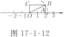2. 如图17-1-12所示,矩形OABC的边OA长为2,边AB长为1,OA在数轴上,以原点O为圆心,对角线OB的长为半径画弧,交正半轴于一点,则这个点表示的实数是( )