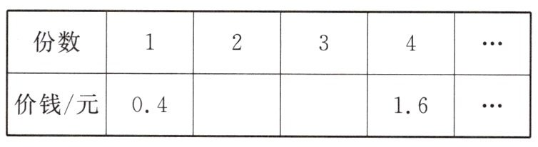 6. 某种报纸的价格是0.4元/份,买$x$份报纸的总价为$y$元,先填写下表,再用含$x$的代数式表示$y$.