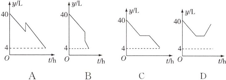 5. 某人驾车从$A$地上高速公路前往$B$地,中途在服务区休息了一段时间. 出发时油箱中存油$40 L$,到$B$地后发现油箱中还剩油$4 L$,则从出发后到$B$地油箱中所剩油$y(L)$与时间$t(h)$之间函数的大致图象是( )