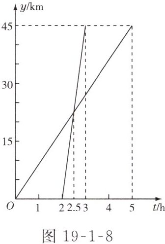 7. 甲骑电动车和乙驾驶汽车沿相同路线行驶$45 km$由$A$地到$B$地,行驶的路程$y(km)$与经过的时间$x(h)$之间的函数关系的图象如图19-1-8所示,请根据这个行驶过程的图象填空: