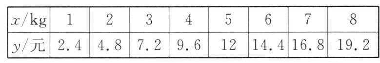 解:(1)观察表格,知质量每增加1 kg,售价就增加2.4元,这样的变化规律可以表示为$y = 2.4x(0\leq x\leq8)$.