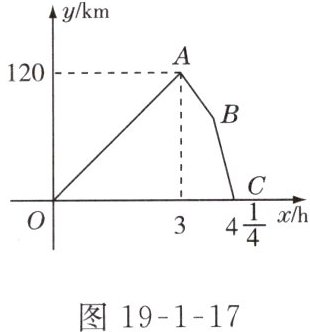 3. 某物流公司的快递车和货车同时从甲地出发,以各自的速度匀速向乙地行驶,快递车到达乙地后卸完物品再另装货物共用45 min,立即按原路以另一速度匀速返回,直至与货车相遇.已知货车的速度为60 km/h,两车之间的距离y(km)与货车行驶时间x(h)之间的函数图象如图19-1-17所示,现有以下四个结论: