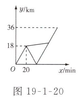 7. 甲、乙两名大学生去距学校36 km的某乡镇进行社会调查.他们从学校出发,骑摩托车行驶20 min时发现忘带相机,甲下车步行前往,乙骑摩托车按原路返回.乙取到相机后(在学校取相机所用时间忽略不计),骑摩托车追甲,在距乡镇13.5 km处追上甲并同车前往乡镇.若摩托车速度始终不变,设甲与学校相距y甲(km),乙与学校相距y乙(km),甲离开学校的时间为x(min),y甲,y乙与x之间的函数图象如图19-1-20所示.结合图象解答下列问题: