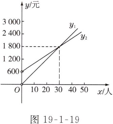 6. 学校准备组织老师去参加某市教研活动,现有甲、乙两家旅行社表示对老师优惠,设参加教研活动的老师有x人,甲、乙两家旅行社收费分别为y1,y2,它们的函数图象如图19-1-19所示,根据图象信息,请你回答下列问题: