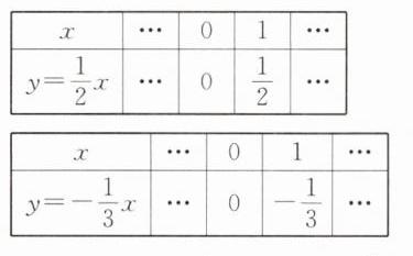 分析:y =$\frac{1}{2}$和y = $-\frac{1}{3}x$都是正比例函数,正比例函数y =$ kx(k\neq0)$的图象是过原点和点(1,k)的直线,所以y =$ \frac{1}{2}x$的图象是过原点和点(1,$\frac{1}{2}$)的直线,y = -$\frac{1}{3}$x)的图象是过原点和点(1,$-\frac{1}{3}$)的直线.