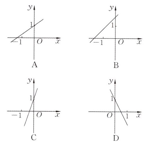 C 解析:观察$y = kx + b$的图象可知$b = 1$,直线与$x$轴的交点为$(-\frac{1}{k},0)$,且$-1 < -\frac{1}{k} < 0$,则$y = 2kx + b$的图象必与$y$轴交于$(0,1)$点,与$x$轴的交点为$(-\frac{1}{2k},0)$. 由$-1 < -\frac{1}{k} < 0$可得$-\frac{1}{2} < -\frac{1}{2k} < 0$. 观察各选项知C正确.