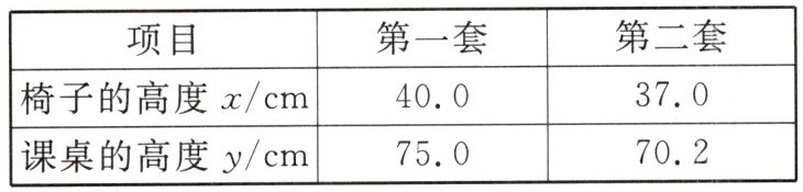 10. 为了保护学生的视力,课桌椅的高度都是按一定比例配套设计的. 假设课桌的高度为$y$ cm,椅子的高度(不含靠背)为$x$ cm,且$y$是$x$的一次函数. 下表列出了两套符合条件的课桌椅的高度: