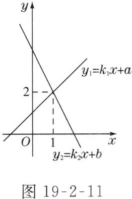 4. 如图 19 - 2 - 11 所示,直线$y_1 = k_1x + a$与$y_2 = k_2x + b$的交点坐标为$(1,2)$,则使$y_1<y_2$的$x$的取值范围为( )