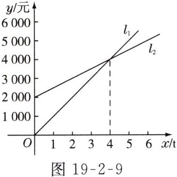 1. 如图 19 - 2 - 9 所示,$l_1$反映了某公司的销售收入与销售量的关系,$l_2$反映了该公司产品的销售成本与销售量的关系. 当该公司赢利(收入大于成本)时,销售量( )