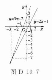 解法 2:在同一直角坐标系中分别画出函数$y = 3x + 2$与函数$y = 2x - 1$的图象(如图 D-19-7 所示),