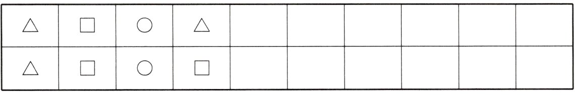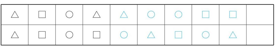 在下面的格子里画上“△”“□”或“〇”,无论怎么画,至少有两列的图形是相同的,不信你接着画一画就知道了。为什么呢?与同桌交流。