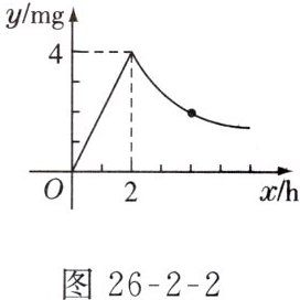 例2 病人按规定的剂量服用某种药物,测得服药后2h,每毫升血液中的含药量达到最大值为4mg,已知服药后,2h前每毫升血液中的含药量$y$(单位:mg)与时间$x$(单位:h)成正比例;2h后$y$与$x$成反比例(如图26 - 2 - 2所示),根据以上信息解答下列问题: