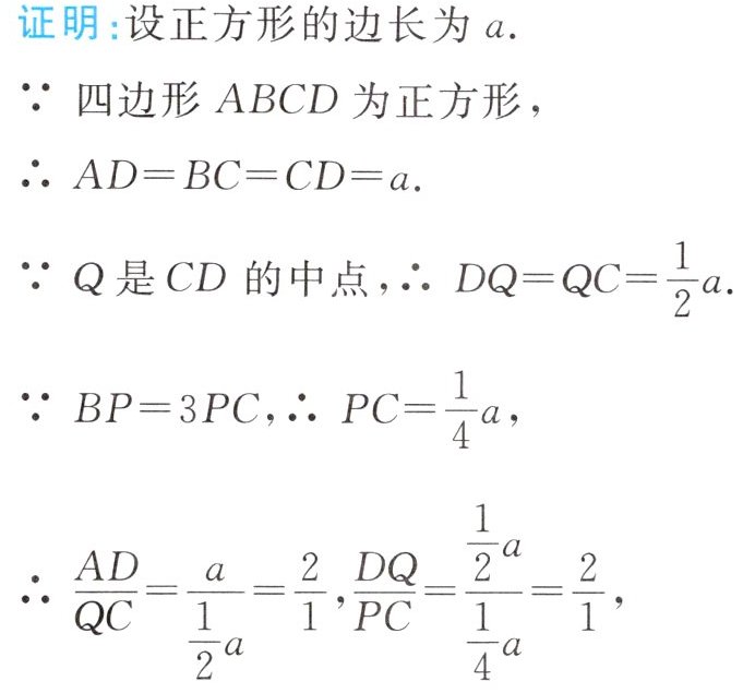 例5 如图27-2-15所示,已知在正方形ABCD中,P是BC上的一点,且BP = 3PC,Q是CD的中点. 求证:△ADQ∽△QCP.