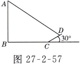 5. 如图27 - 2 - 57所示,小明想测量电线杆AB的高度,发现电线杆的影子恰好落在土坡的坡面和地面上,量得CD = 4 m,BC = 10 m,CD与地面成30°角,且此时测量1 m的标杆影长为2 m,求电线杆AB的高度.