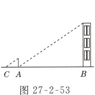 1. 小明在测量楼高时,先测出楼房落在地面上的影长BA为15 m(如图27 - 2 - 53所示),然后在A处树立一根高2 m的标杆,测得标杆的影长AC为3 m,则楼高为( )