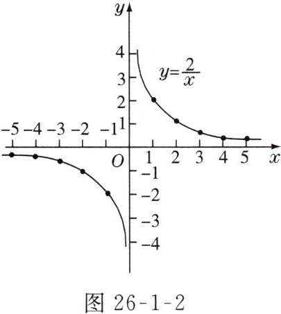 连线:把$y$轴左边各点和右边各点分别用一条平滑的曲线连接起来就得到$y = \frac{2}{x}$的图象,如图26 - 1 - 2所示.