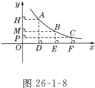 7. 如图26 - 1 - 8所示,$A(x_1,y_1)$,$B(x_2,y_2)$,$C(x_3,y_3)$是反比例函数$y = \frac{k}{x}$图象在第一象限分支上的三个点,且有$x_1<x_2<x_3$,过$A$,$B$,$C$三点分别作坐标轴的垂线,得长方形$ADOH$,$BEOM$,$CFOP$,它们的面积分别为$S_1$,$S_2$,$S_3$,则$S_1 = S_2 = S_3$的大小关系是__________.