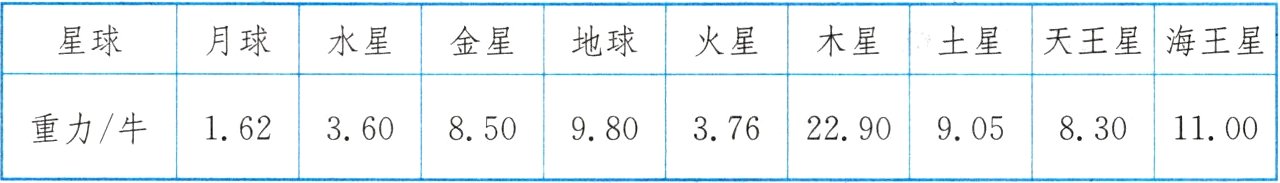 材料二 由于不同星球的质量和半径各不相同,所以同一个物体在不同星球上受到的重力并不相等。下表反映质量为1千克的物质在不同星球上受到的重力。