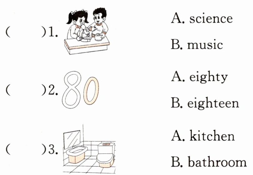 1.B 【解析】PE(体育)、art(美术)和 maths(数学)都表示学科,twenty(二十)表示数量,故选 B。 2.A 【解析】oranges(橙子)、pears(梨)和 bananas(香蕉)都表示水果,study(书房)表示房间,故选 A。 3.B 【解析】maths(数学)、music(音乐)和 English(英语)都表示学科,apple(苹果)表示水果,故选 B。 4.C 【解析】bathroom(浴室)、bedroom(卧室)和 kitchen(厨房)都表示房间,Chinese(语文)表示学科,故选 C。 5.A 【解析】twenty - one(二十一)、twenty(二十)和 eighty(八十)都表示数量,room(房间)不属于此类,故选 A。
