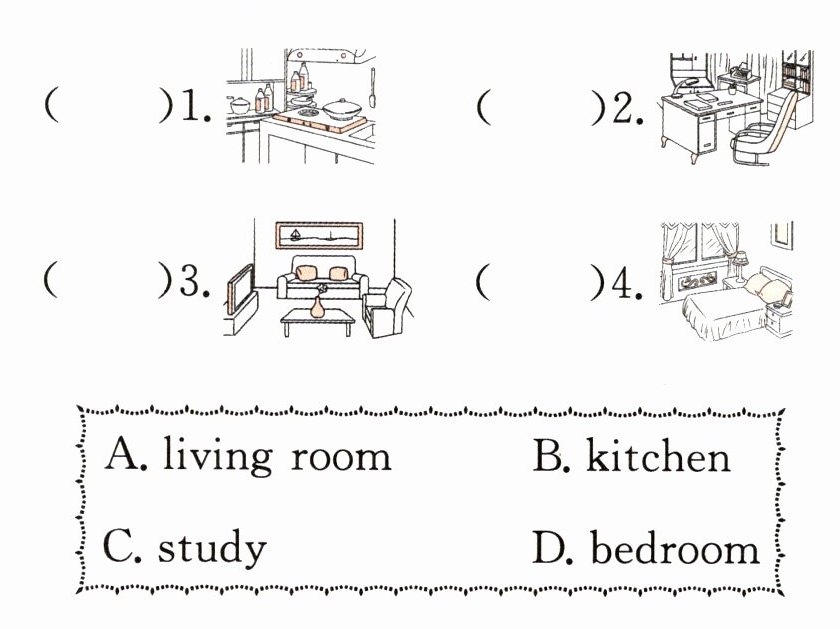 1.C [解析]a sofa and a TV(一个沙发和一台电视)应该在起居室里,故选C。
