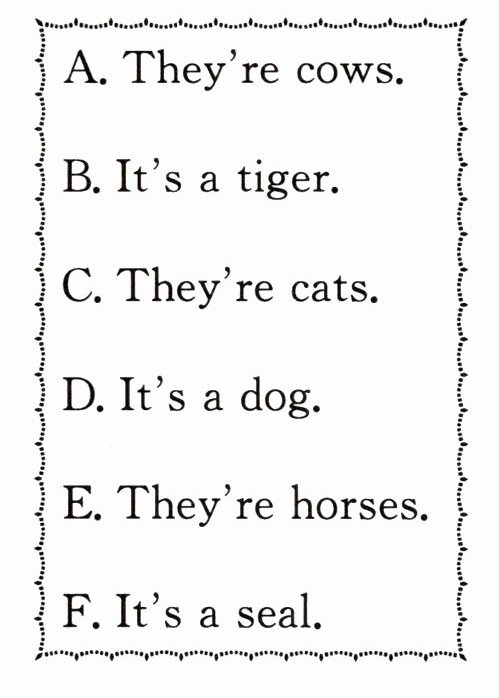 四、Amy和Bob来到农场,他们看到了很多动物。将下列句子按1~4排序,组成一段对话。