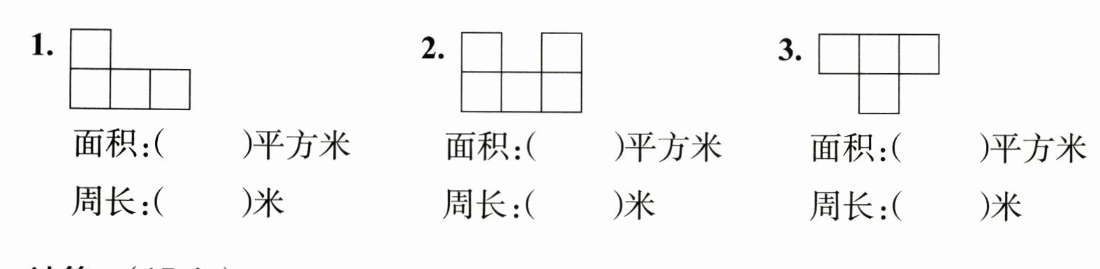 四、组成下面图形的每个小正方形的面积都是1平方米,请你算出下列图形的面积和周长。(12分)
