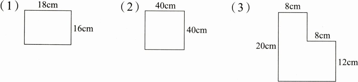 (1)$18×16 = 288$($cm^{2}$)(2)$40×40 = 1600$($cm^{2}$)(3)$20×(8 + 8)-(20 - 12)×8 = 256$($cm^{2}$)