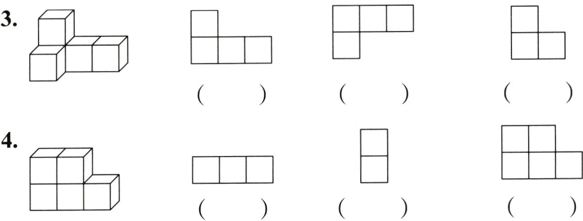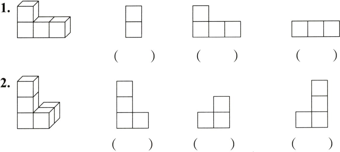 二、搭一搭,看一看,找出从前面、上面、左面看到的图形。(前面的画“√”,上面的画“○”,左面的画“”)(12分)
