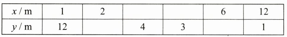 2. 长方形的面积为12$m^2$,相邻的两条边$x$,$y$的关系如下表,请先将表格填写完整。(10分)