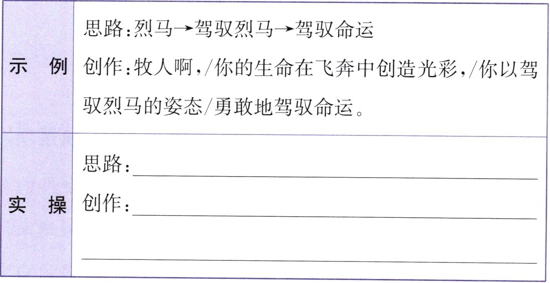 示例:战马→驾驭战马→驾驭使命 将军啊,/你的身躯在飞奔中守卫山河,/你以驾驭战马的英姿/坚定地驾驭使命。