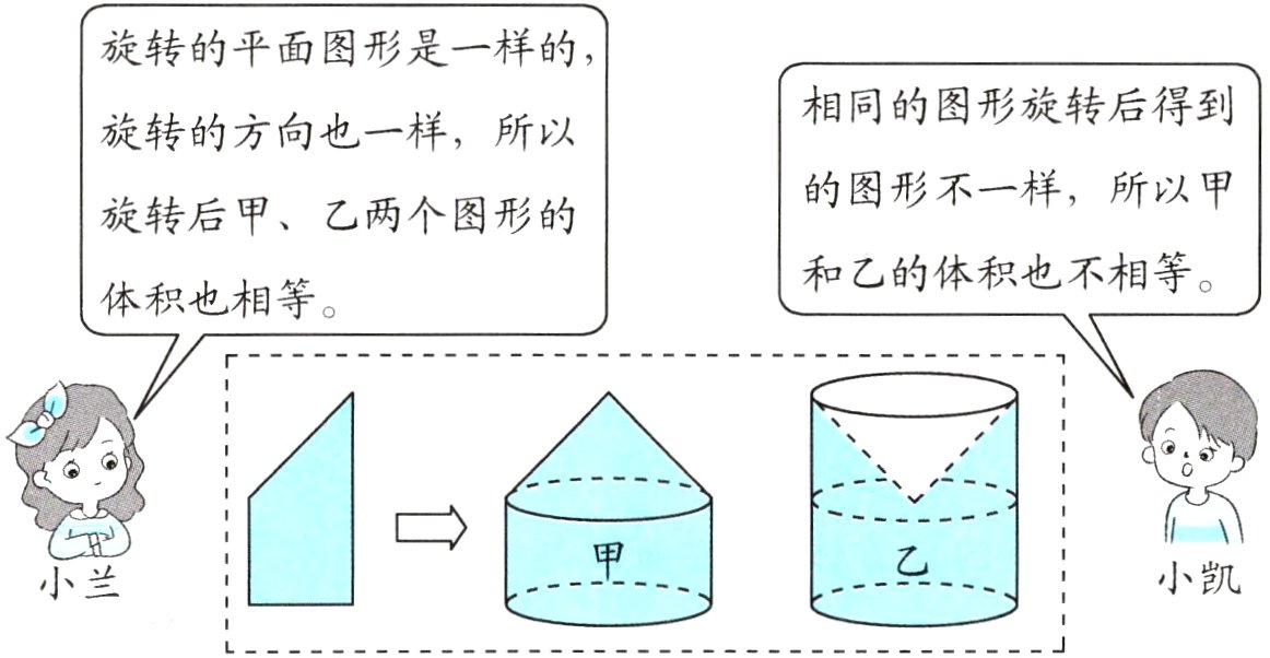 3.新趋势 推导探究 如图,小凯和小兰在探究直角梯形绕上底和下底所在直线旋转一周后得到的图形,图中直角梯形下底的长度是上底长度的2倍。