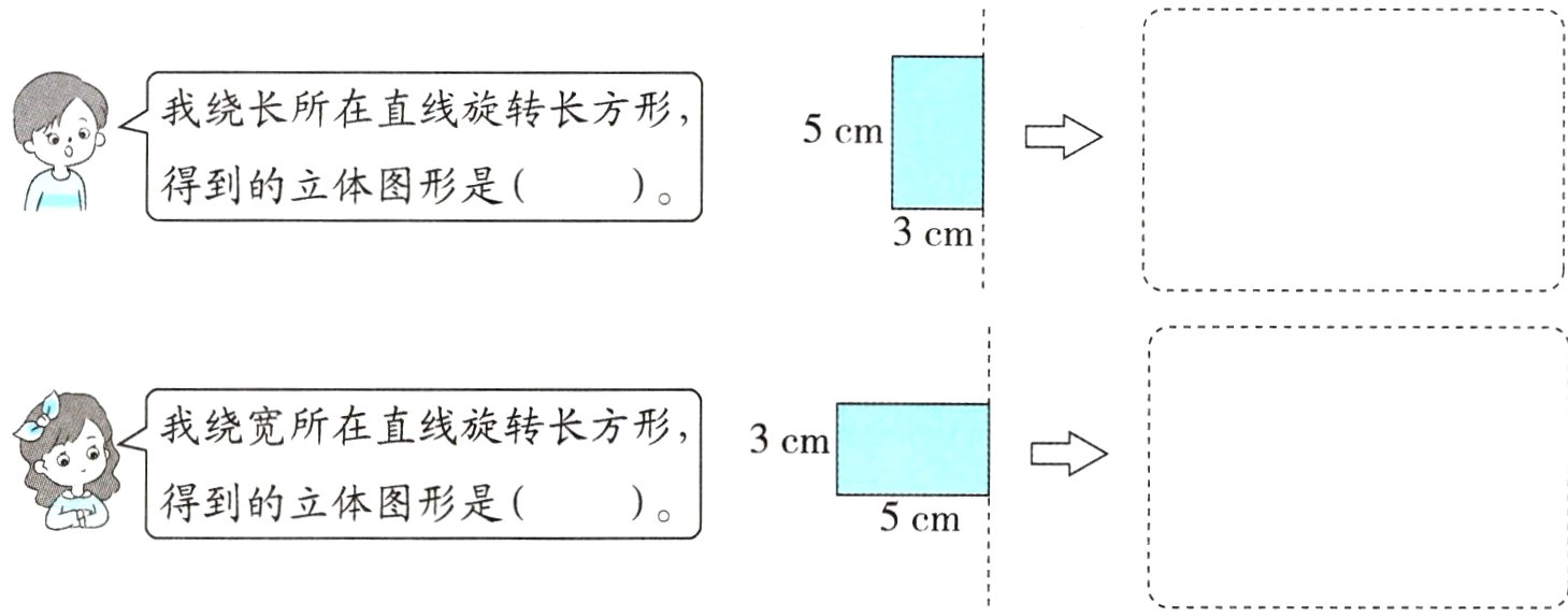 例1 有一个长为5厘米,宽为3厘米的长方形,它分别绕长和宽所在直线旋转一周,得到的立体图形是什么?体积分别是多少?