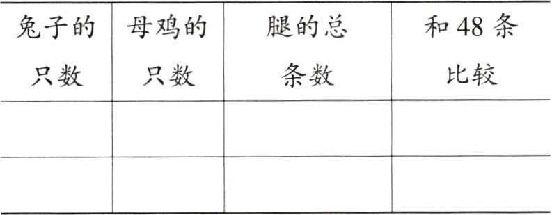 |兔子的只数|母鸡的只数|腿的总条数|和48条比较|