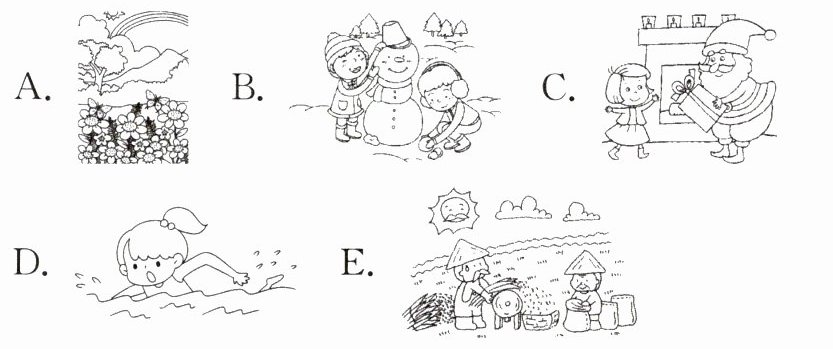 1. green 2. flowers 3. go on a picnic 4. go swimming 5. autumn 6. pick apples 7. make a snowman
