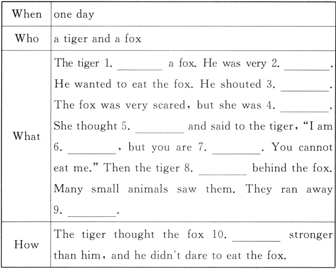 1. saw 2. hungry 3. excitedly 4. clever 5. quietly