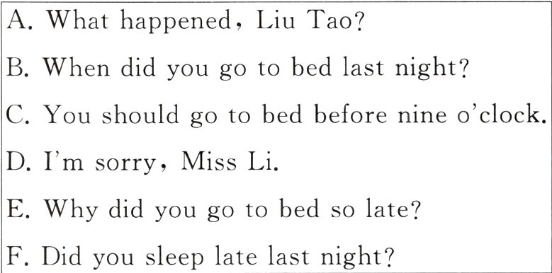 Liu Tao:I got up late this morning,Miss Li. C. You should go to bed before nine o’clock.