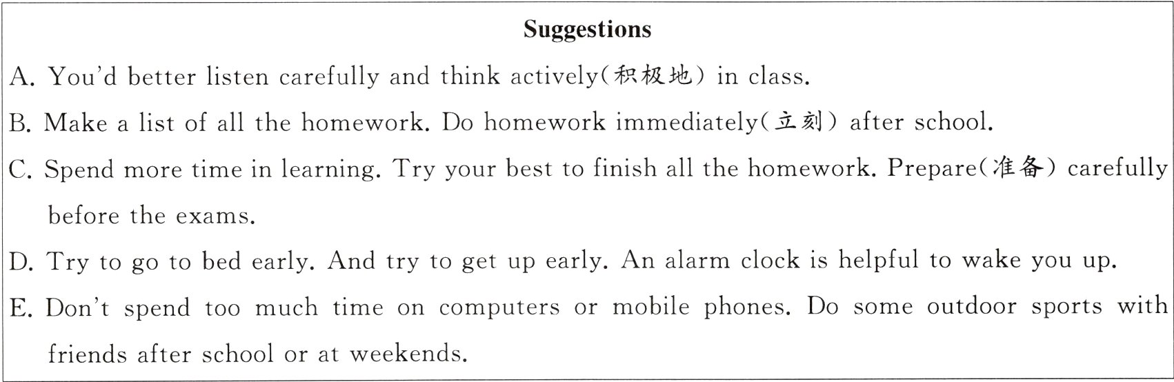 C. Spend more time in learning. Try your best to finish all the homework. Prepare(准备) carefully before the exams.
